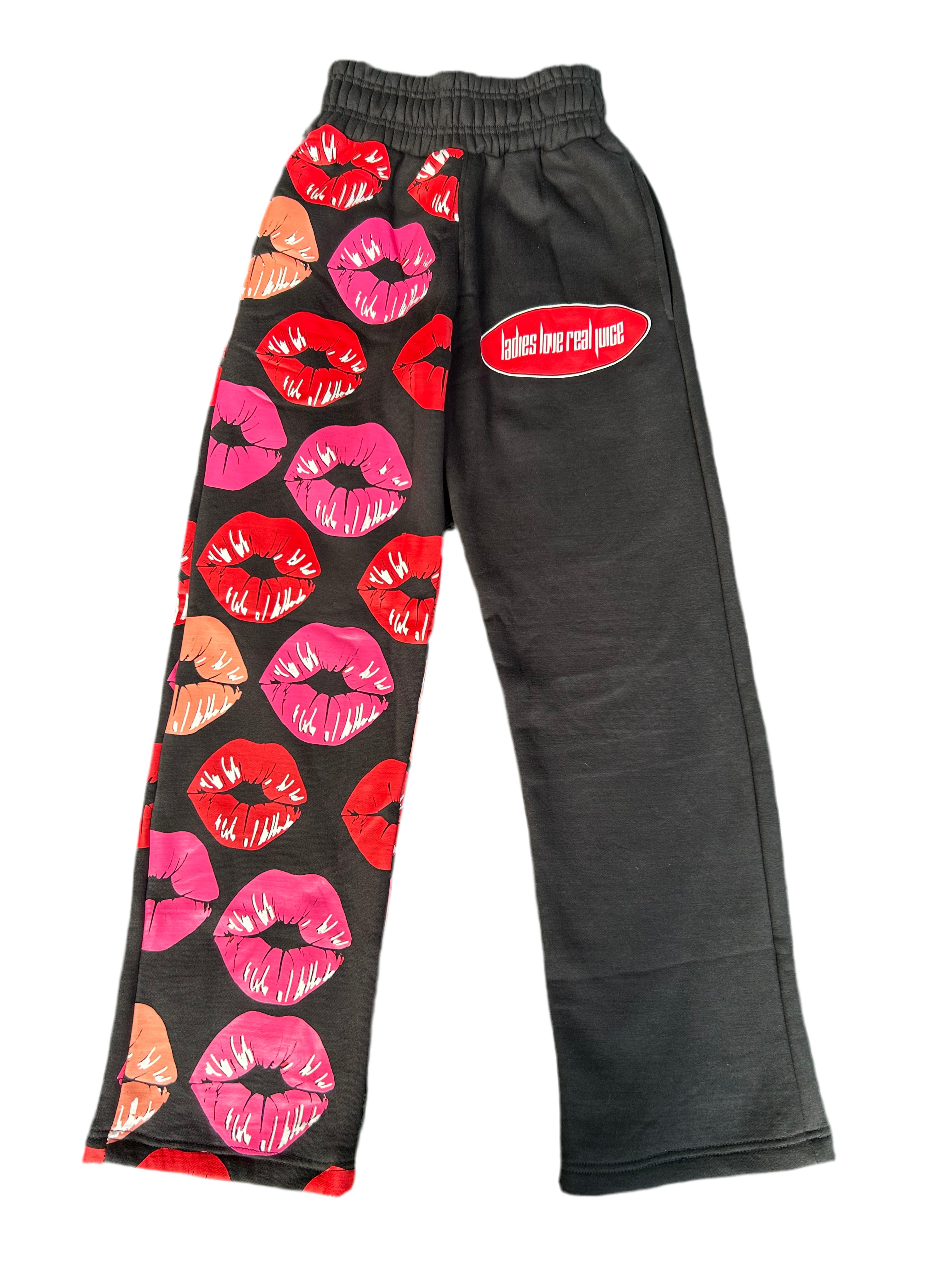 These sweats are printed with an all-over kiss print down the front and back of leg and bold “Ladies Love Real Juice” logo. Made from 450 GSM 100% cotton for a thick, premium feel with a baggy, oversized fit