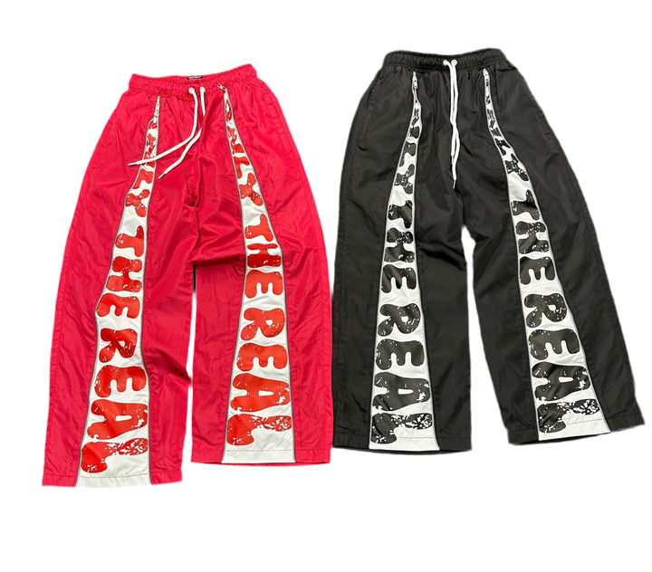 Side zippers run the full length, finished with bold “ONLY THE REAL” prints on both legs.